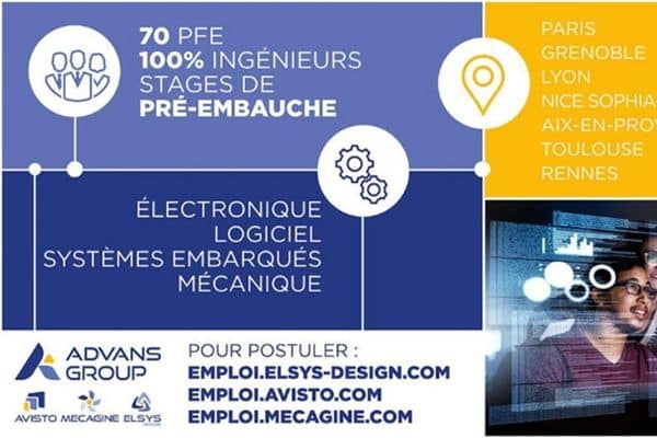 Elsys Design, Avisto et Mecagine, des sociétés d’Advans Group, proposent des stages de pré-embauche de niveau BAC+5 à Paris (20), Grenoble (15), Nice Sophia Antipolis (12), Lyon (7), Rennes (7), Toulouse (6) et Aix (3). Les activités débuteront au premier trimestre 2023.