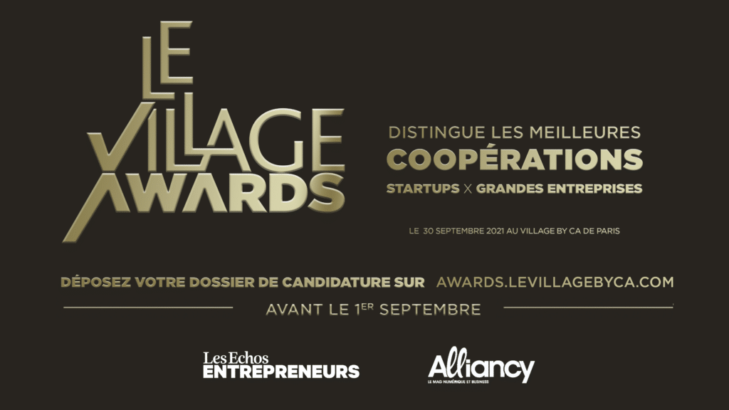 Les Village Awards récompensent les meilleures coopérations de l’année entre startups et grands groupes/ETI lors d’une grande soirée le 30 septembre 2021 au Village by CA Paris. Cet appel à candidatures est ouvert à tous les duos startup/grand groupe internes et externes au réseau Le Village by CA.