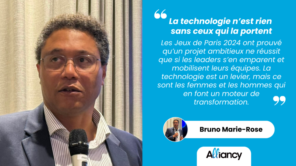 Avec Bruno, cette collaboration va bien au-delà d’un simple partenariat : c’est une alliance fondée sur la transmission d’expériences et l’action, pour aider les décideurs à relever les défis de transformation qui se dressent devant eux. Lors des Jeux Olympiques et Paralympiques de Paris 2024, le numérique s’est mis au service d’une aventure humaine et technologique sans précédent, source d’inspiration pour nos organisations. Bruno est convaincu — et nous partageons cette vision — que, si les leaders savent la porter au bon niveau, la Technologie peut changer l’impact qu’une organisation a sur son activité, son écosystème, voire son rôle dans la société.À travers son authenticité et son humilité, des valeurs que nous partageons au quotidien, Bruno Marie-Rose nous rappelle qu’il est essentiel de faire grandir ses équipes et de les mobiliser autour d’une vision claire et commune. Fort de son expérience unique, la volonté de Bruno de passer le témoin entre toutes les parties prenantes d’une organisation pour réussir renforce directement notre mission chez Alliancy : accompagner les décideurs dans leur ambition de conjuguer impact humain et transformation durable.