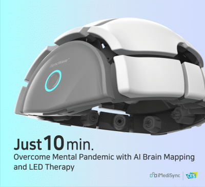 Le casque coréen iSyncWave de la société iMediSync, posé sur la tête, scanne les ondes cérébrales pour réaliser un électroencéphalogramme. Il s’agit du 1er appareil thérapeutique qui intègre à la fois la cartographie cérébrale EEG et la thérapie LED.