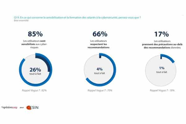 L’axe sensibilisation est au rang des mesures qui progressent pour faire face aux défis de la cyber. 8 entreprises sur 10 mènent des campagnes de sensibilisation auprès des collaborateurs. La culture de la cybersécurité n’est pourtant toujours pas suffisamment ancrée dans les organisations, seuls 2/3 des utilisateurs respectent les recommandations.
