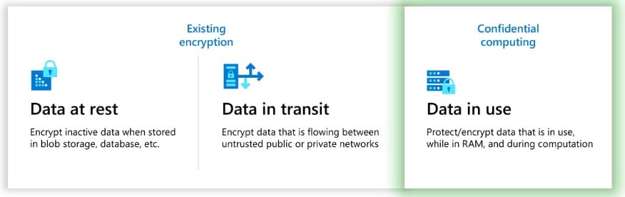 Celui-ci vise à interdire l’accès à ces données lorsqu’elles sont en traitement en utilisant une architecture hardware appelée TEE (Trusted Execution Environment) qui est un co-processeur à l’intérieur de la CPU de la machine. Les droits d’accès administrateur au TEE sont protégés et seul le propriétaire du traitement bénéficie de droits spécifiques pour accéder aux données. De plus en cas de tentative d’accès frauduleux, le TEE bloque l’accès et stop le traitement des données (pour éviter qu’elles ne soient écrites en mémoire)[1].