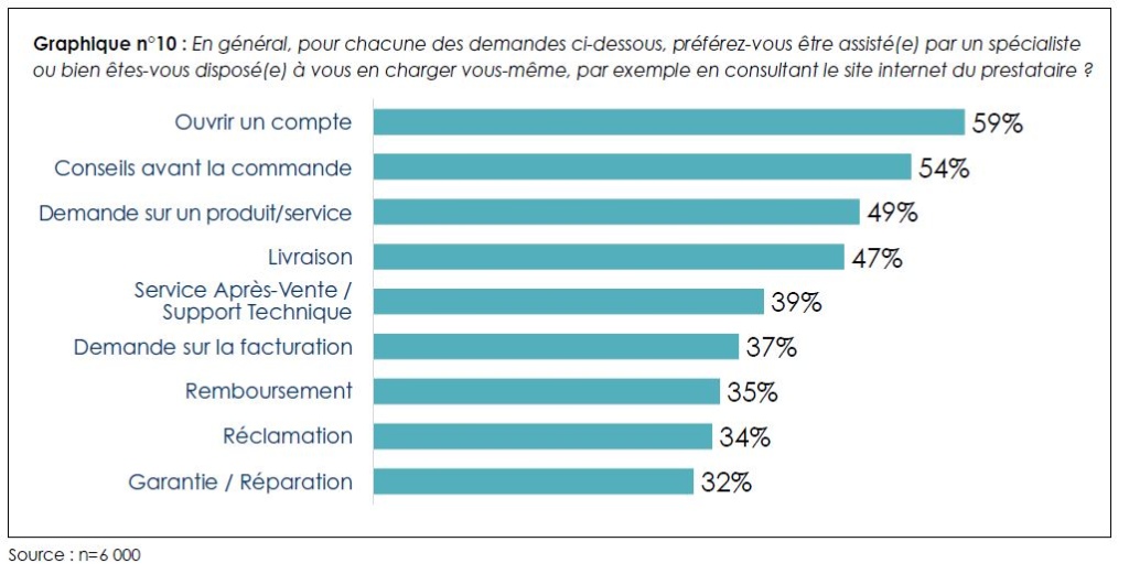 De la même manière, les participants progressent au fur et à mesure vers une plus grande autonomie, illustrée par l’adoption du libre-service. Parmi les six pays, c’est en France que la volonté d’adopter ces services est la plus forte, et dans tous les pays, une corrélation se dessine : dès lors qu’il s’agit d’une demande simple et antérieure à l’achat, l’acceptation est forte. En France, l’ouverture d’un compte (71 %), les conseils préalables à un achat (68 %), les demandes concernant un produit ou un service (62 %) et les services de livraison (61 %) sont autant de services qui sont favorablement effectués en libre-service.