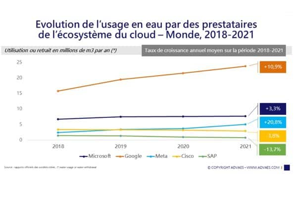 Mais alors que ces entreprises fortement consommatrices en eau contiennent et réduisent leur consommation, celles du secteur du numérique analysées par AdVaes suivent une courbe inverse, à la hausse. Ainsi, Microsoft déclare avoir consommé 4,5 millions de mètres cubes d’eau en 2021 contre 4 millions en 2020, soit une augmentation de 12,5 %. De son côté, Google indique une consommation de 17,2 millions de mètres cubes d’eau en 2021 pour l’ensemble de ses activités, en augmentation de 21,8 % par rapport à 2020.