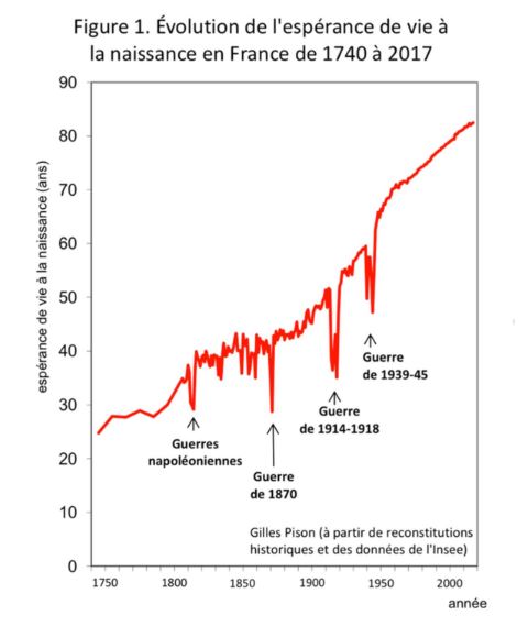 L’allongement de l’espérance de vie ne dit pas autre chose : l’humanité résiste de mieux en mieux aux aléas, et reste son pire ennemi (les guerres), comme le montre la courbe de l’espérance de vie en France reconstituée par Gilles Pison.