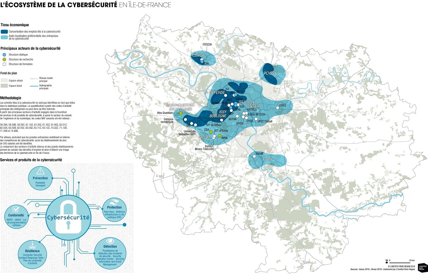 « L’écosystème de la cybersécurité en Ile-de-France s’articule autour d’un axe clair Paris-Saint Quentin-en-Yvelines. A Paris, les petites entreprises innovantes se sont multipliées que ce soit au cœur du Silicon Sentier ou ailleurs. Et à Saint Quentin-en-Yvelines, nous avons le berceau historique de l’industrie francilienne et du secteur de la Défense, naturellement très actif en sécurité numérique » explique Renaud Roger, économiste-urbaniste pour le département Economie de l’Institut Paris-Région.
