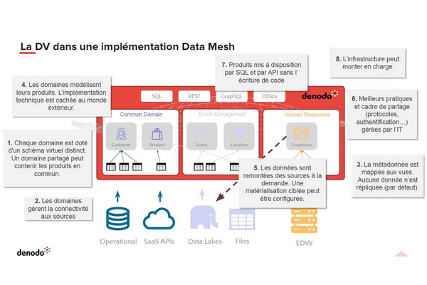 Compte tenu de son cœur de business, l’éditeur promeut les bénéfices permis par la combinaison du Data Mesh et de la virtualisation logique des données. Le concept sous-jacent demeure bien néanmoins agnostique du point de vue des technologies, même si virtualisation et cloud peuvent contribuer à faciliter sa mise en œuvre.
