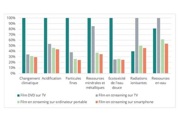 Comparaison des résultats environnementaux des différents scénarios pour « Regarder 1h de film en France en 2020 » © Ademe