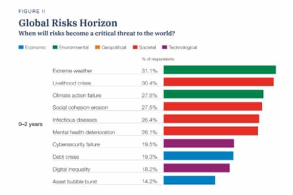 De même, dans la synthèse des risques identifiés pour les deux prochaines années, les grandes entreprises mondiales mettent en avant les risques climatiques et positionnent le risques Cyber en 7e position.
