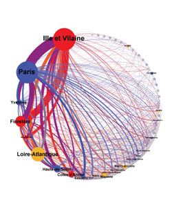 La vue circulaire (droite) se lit différemment : elle distribue les départements en fonction du nombre de liens de coopération entretenus entre eux, dans une logique interrégionale (en rouge, les départements bretons, en jaune les Pays de Loire, en bleu Paris et l’Ile-de-France).