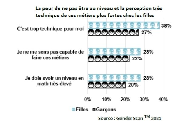 La peur de ne pas se sentir capable de faire ces études et la perception technique de ces métiers est plus prononcée chez les filles que les chez les garçons.