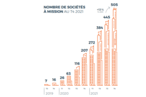 Aujourd’hui, plus de 600 entreprises françaises sont des entreprises à mission. Le dernier baromètre de l’Observatoire spécialisé (mars 2022) nous apprend que la progression est rapide : 207 fin 2019, 505 fin 2021…
