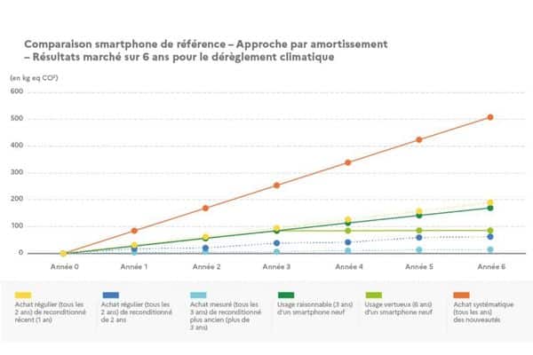 Le graphique ci-dessous permet d’identifier simplement les scénarios d’achat de smartphones reconditionnés plus ou moins vertueux que l’achat neuf (d’un point de vue dérèglement climatique) selon six comportements d’achat sur une période de six années :