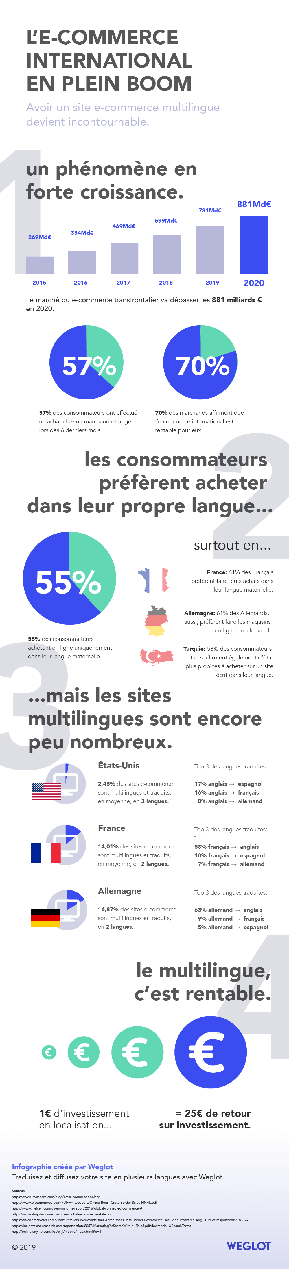 Cette infographie sur l’essor du e-commerce international et les habitudes d’achats des e-consommateurs a été réalisée par Weglot, éditeur d’une solution SaaS permettant de traduire un site en plusieurs langues.