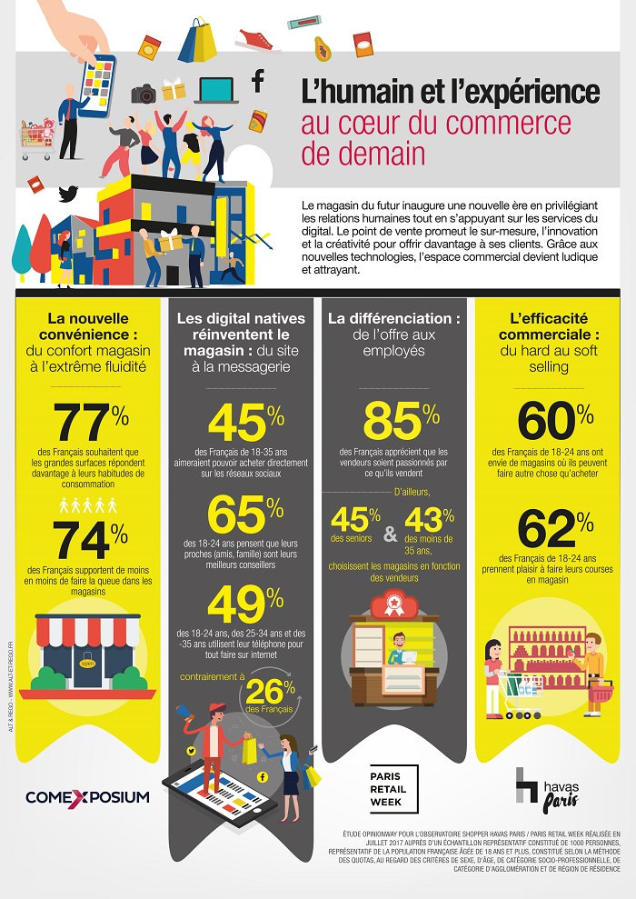 Infographie – L’humain et l’expérience au coeur du commerce de demain Anne-Lise Marco il y a 8 ans Cette étude réalisée par Paris Retail Week en partenariat avec Havas Paris porte sur le second volet de l’observatoire du comportement des consommateurs.