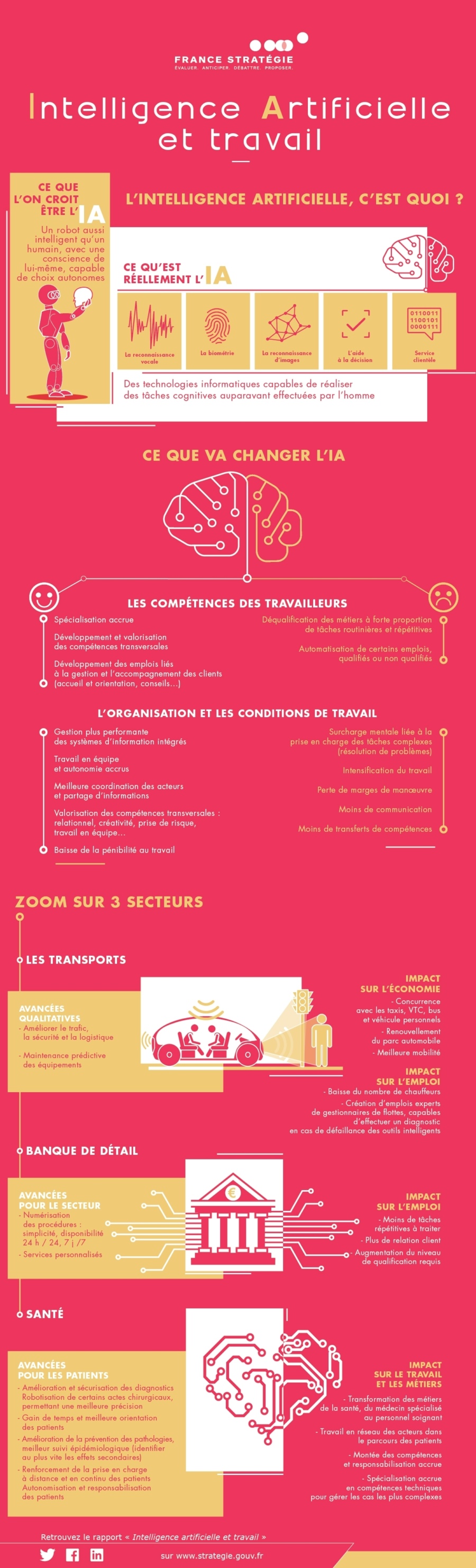 Muriel Pénicaud, ministre du Travail, et Mounir Mahjoubi, secrétaire d’État chargé du Numérique, ont demandé à France Stratégie d’étudier plus particulièrement les impacts de l’intelligence artificielle sur le travail.Les résultats du rapport sont dévoilés dans cette infographie. L’intelligence artificielle représente-t-elle une rupture technologique telle que le travail s’en trouvera transformé de manière brutale ou s’inscrit-elle  dans la continuité des transformations numériques à l’œuvre depuis plusieurs décennies ?