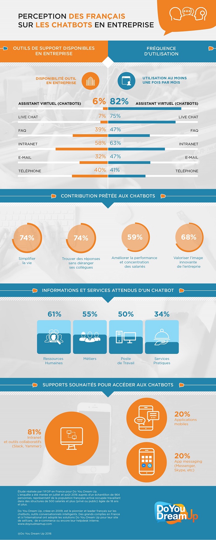 Do You Dream Up, pionnier et leader des chatbots (agents conversationnels) en France, a mené avec l’IFOP une étude auprès des salariés et du grand public pour connaître leur perception des agents conversationnels et de leur utilisation au quotidien.