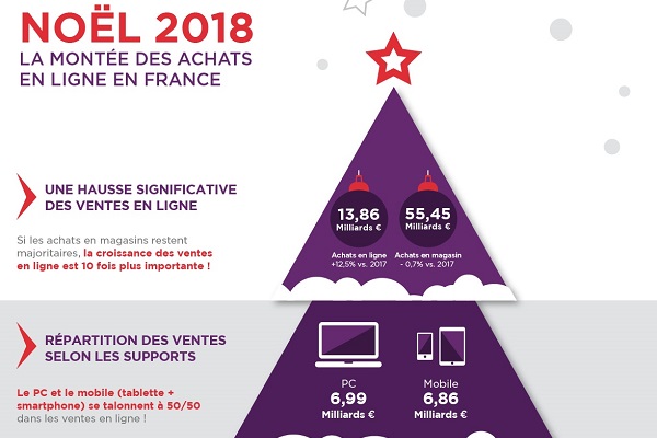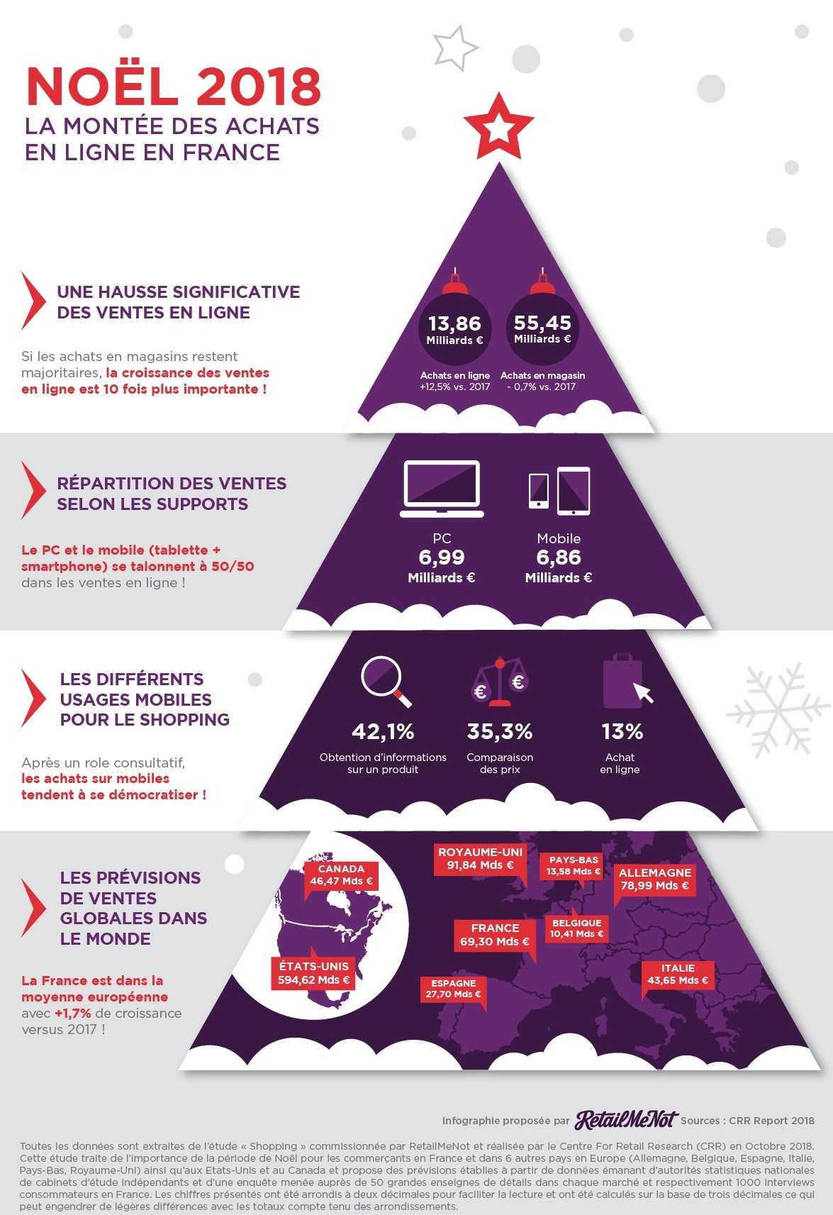 L’infographie réalisée par Retailmenot illustre l’augmentation des achats en ligne avec une croissance de 12,5 % en comparaison avec 2017.