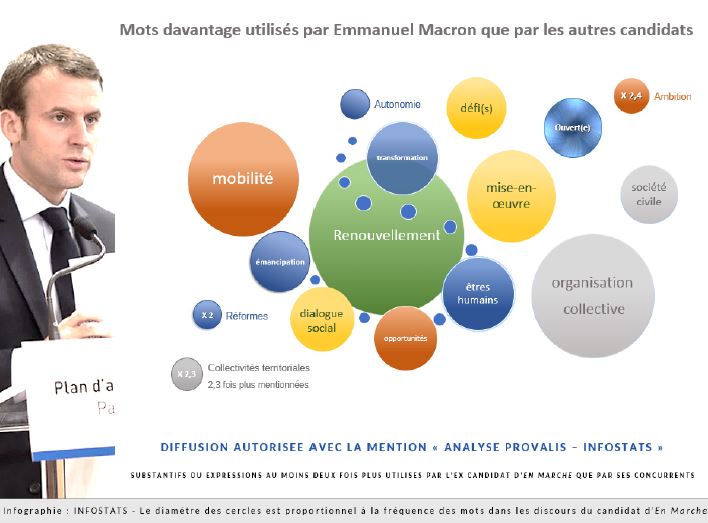 Infostats, nouvel Institut de sondages français, a conclu en avril un partenariat avec Provalis, entreprise canadienne, leader de l’analyse sémantique. Infostats présente une première analyse, à partir du traitement statistique de plus de 150 discours des principaux candidats à la Présidentielle.