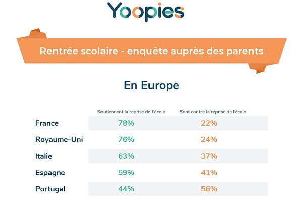 Malgré l’incertitude concernant l’évolution de l’épidémie Covid-19, une augmentation des cas à travers l’Europe, ainsi que les craintes d’une deuxième vague à l’automne, une chose est sûre : la plupart des parents à travers l’Europe veulent que leurs enfants retournent à l’école. Yoopies, leader européen des services de garde d’enfants, a mené une enquête auprès de près de 3000 parents en France, au Royaume-Uni, en Espagne, au Portugal et en Italie. C’est en France que les parents sont les plus impatients : l’enquête montre que 78% soutiennent la reprise de l’école dans les conditions annoncées par le gouvernement.