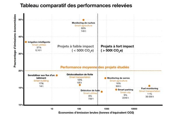 Sur l’ensemble des projets présentés dans le livre blanc d’Orange Business Services et de BearingPoint, la moyenne de réduction d’émissions brutes est de 20 %, tout comme le gain de performance opérationnelle qui l’accompagne. Les projets à faible impact absolu (réductions inférieures à 500 tonnes d’équivalent CO2) présentent des impacts relatifs élevés et à forte variance, allant de 12 à 50 %. « Ces résultats sont prometteurs quand on note que, selon le World Economic Forum, 95 % de l’ensemble des projets IoT sont de petite à moyenne taille, adressables par les PME et les collectivités », commentent les auteurs du livre blanc.