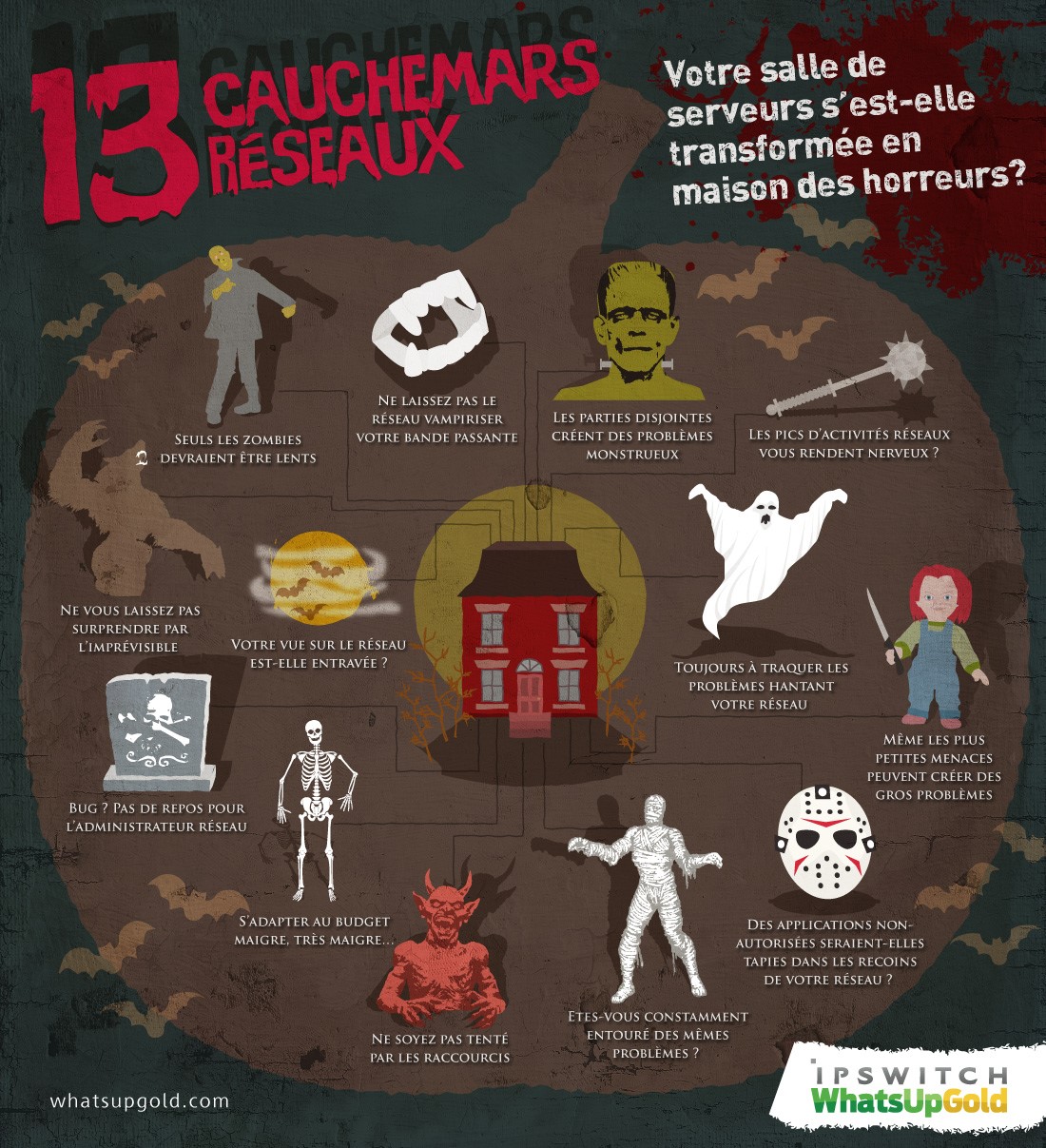 En se basant sur des retours réels de clients, c’est-à-dire les administrateurs réseaux, Ipswitch, Inc, a développé une infographie légère et fantasmagorique montrant les 13 cauchemars auxquels sont confrontés les responsables de la gestion de réseaux.