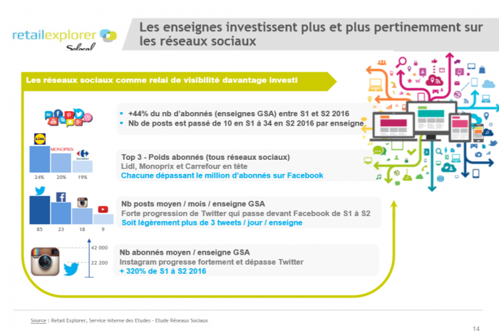 Enfin, sur les réseaux sociaux, tout le monde est désormais de plus en plus présent. Les chiffres sont là : + 44 % d’abonnés entre S1 et S2 2016. Les enseignes ont enfin pris sérieusement conscience de l’importance du traitement de leur image sur les réseaux sociaux.