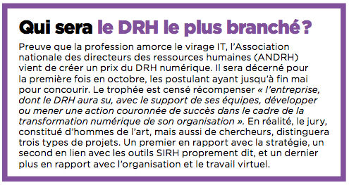 Même les domaines les plus traditionnels de la fonction ressources humaines, comme les relations avec les syndicats, cèdent aux sirènes de la IT. Après les systèmes d’infor mation RH (SIRH), voici les systèmes d’information pour relations sociales (SIRS), à l’image de la suite logicielle que lance Docapost. Cette filiale du groupe La Poste connaît bien le sujet. Elle assure l’organisation technique des élections prud’homales pour le compte de la Direction générale du travail et participe à la mesure des audiences syndicales, au niveau national. Saint Gobain, Intermarché et Veolia sont quelquesuns des premiers utilisateurs de cet outil qui assemble des applications de préparation des élections et de génération des procèsverbaux électoraux. SIRS inclut aussi la compilation de la base de données économiques et sociales, obligatoire à partir de cette année, l’aide à la constitution d’un digest des accords d’entreprise, voire le rappel des signataires et non signataires de chaque texte. Le tout en garantissant la conformité à la réglementation du moment. L’intérêt est particulièrement évident pour les entre prises multisites contraintes de manipuler des données locales. Coût estimé : 50 000 euros pour une entre prise de 10 000 personnes, et 15 000 euros par an pour la maintenance de l’outil fonctionnant en mode SaaS (Software as a Service), dans le cloud. La cible privilégiée reste le CAC 40. Pour autant, relativise Xavier Monmarché, directeur commercial de Docapost BPO (l’entité directement chargée du produit), l’outil convient aussi à tout employeur de plus de 300 salariés. « Le retour sur investissement peut être très rapide, dans la mesure où les directeurs RH se débarrassent des charges administratives pour se concentrer sur le pilotage », défendil. Docapost n’est pas seul sur le créneau. Il existe des produits effectuant séparément l’une ou l’autre de ces fonctions automatiques.