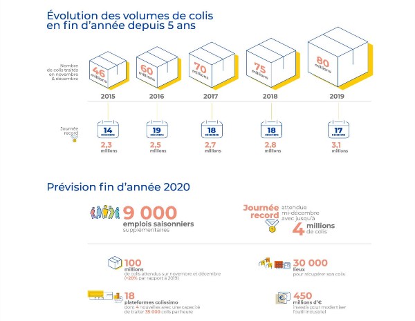 Quoiqu’il en soit, l’augmentation du trafic postal à laquelle La Poste doit faire face nécessite des mesures anticipées. Elle prévoit, pour le mois de décembre prochain, de traiter jusqu’à 4 millions de colis en une seule journée (contre 3,1 millions en 2019). Pour la filiale spécialisée en livraison express Chronopost, les volumes traités seraient de l’ordre de 800 000 à plus de 1,3 millions de colis par jour. Et de 400 000 à 500 000 pour DPD France.