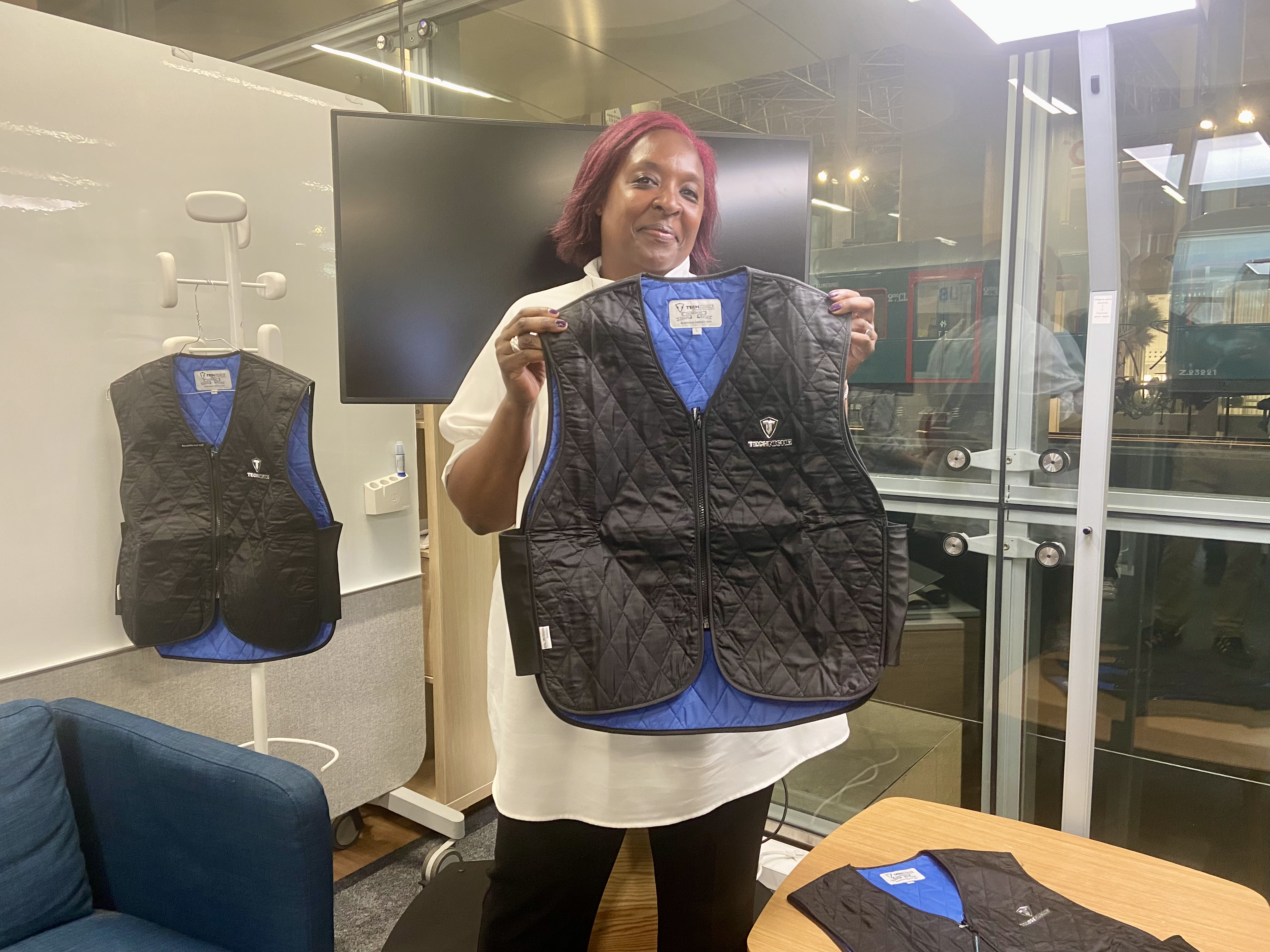 Gilda Binam, chargée de mission prévention sécurité et santé au travail au sein du groupe RATP, présente la veste rafraîchissante
