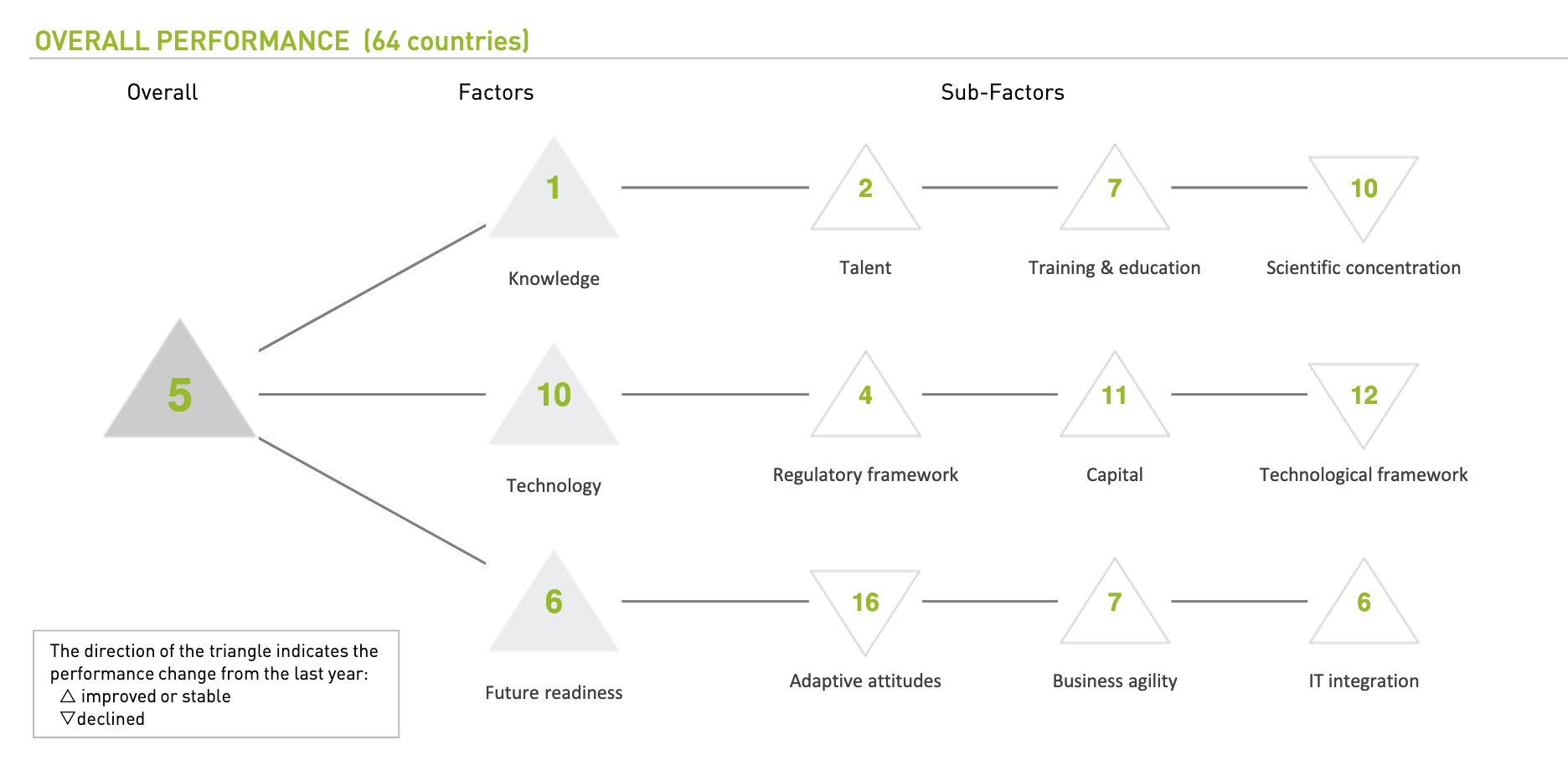 Selon le World Digital Competitiveness Ranking, qui mesure la capacité des économies à adopter les technologies numériques pour assurer leur transformation économique et sociale, la Suisse se classe à la 5e place mondiale (sur 64 pays étudiés au total). Pour parvenir à cette place enviée (la France est 27e), l’atout principal de la Confédération helvétique repose sur la qualité de sa main-d’œuvre et de son système éducatif.