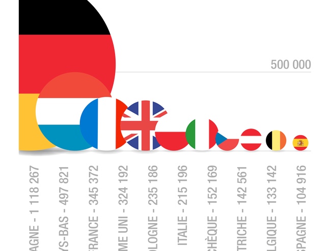 La France est le 3e pays européen à consommer ces extensions avec près de 350 000 noms de domaines. Elle se place toutefois derrière les Pays-Bas et surtout en retrait de l’Allemagne qui caracole en tête avec plus d’1,1 millions de noms enregistrés à elle seule.