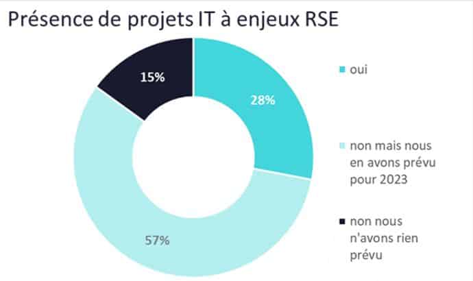 De plus en plus de projets de Numérique Responsable pour les DSI en 2023 : les directeurs des systèmes d’information s’emparent des enjeux environnementaux liés à leur activité propre : 28% d’entre eux ont des projets IT qui viennent soutenir les enjeux de RSE « métier » de leur entreprise et 57% en auront en 2023.
