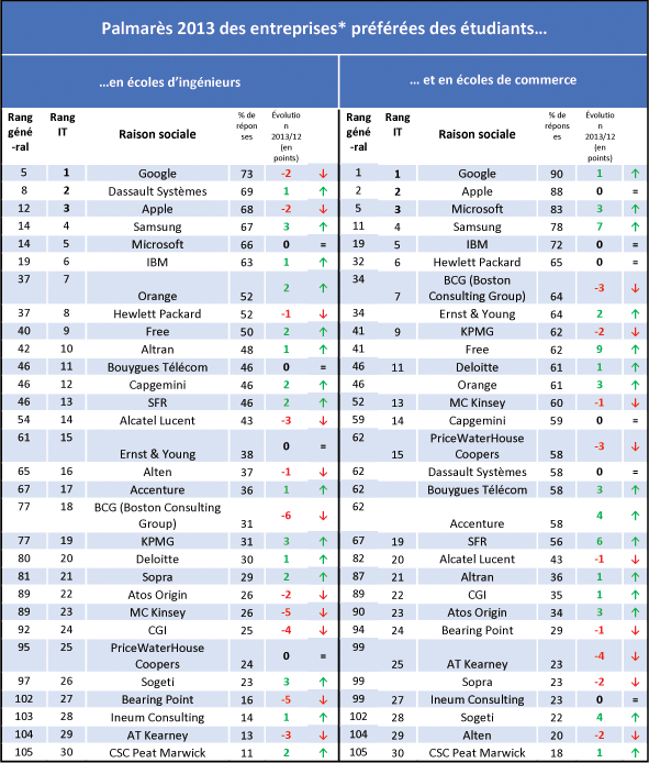 Pour autant, un groupe industriel français tire son épingle du jeu chez les élèves des écoles d’ingénieurs. Dassault Systèmes arrive en deuxième position du classement IT (8ème au rang général), après Google certes, mais devant Apple ! Le leader mondial sur le marché des logiciels de gestion du cycle de vie des produits (PLM) gagne même un point dans ce classement par rapport à l’an dernier, quand Google et Apple en perdent chacun deux. Orange, notre leader national des télécoms, au 7ème rang du classement IT (37ème au rang général), gagne également deux points. Un léger mieux.