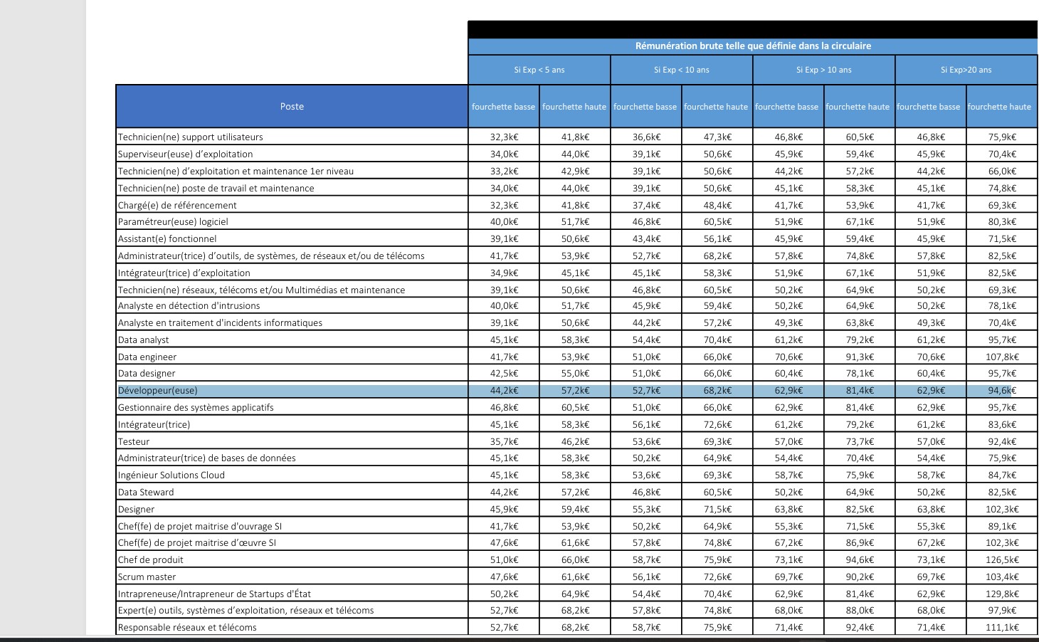 En 2019, un référentiel de rémunération des 55 métiers de la filière numérique a été élaboré conjointement par la direction interministérielle du numérique (DINUM) la direction générale de l’administration et des finances publiques (DGAFP) et la direction du budget (DB), en lien avec les acteurs RH et SI de la filière numérique. Il définit des valeurs de salaires sur l’ensemble des métiers de la filière numérique, avec des fourchettes basses et hautes, en fonction du métier et de l’expérience de chaque candidat ou agent déjà en place. Il est par ailleurs applicable à l’ensemble des administrations étatiques.