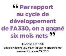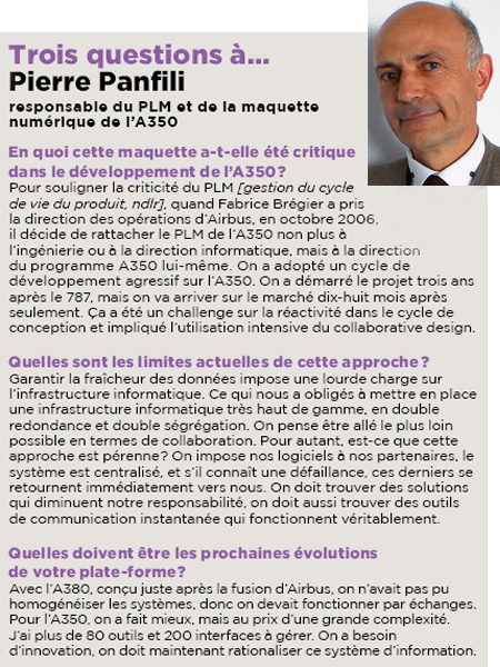 performances. » Le nombre d’intervenants dans la production de l’avion augmente, mais aussi le nombre d’ingénieurs qui participent à sa conception dans une approche de codesign désormais généralisée. Sur le programme A350, la part de la sous-traitance atteint 80 %, y compris sur le volet études. Une approche qui a une conséquence directe sur les échanges de données, comme le souligne Pierre Panfili : « Nous nous appuyons sur une centaine de fournisseurs de premier niveau qui, eux-mêmes, sous-traitent. Cela représente des échanges à n’en plus finir. Ce qui signifie que si on n’optait pas pour une maquette numérique centrale, la maîtrise de la configuration de l’appareil allait tourner au cauchemar. »