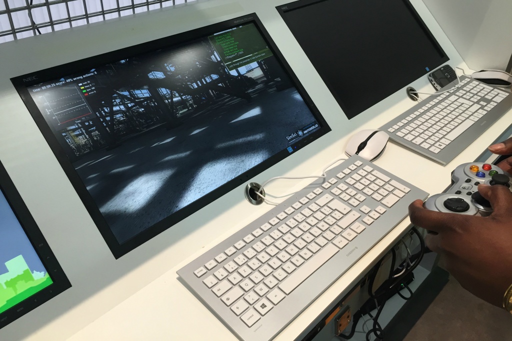 A la manière d’un simulateur, Eyesim permet à celui qui le commande de naviguer dans l’unité de production. Le logiciel peut être paramétré pour simuler des incidents comme un départ de feu, une fuite de gaz, une valve mal refermée ou encore de mauvaises conditions météorologiques. Eyesim modélise également la salle de contrôle de l’unité de production et permet à un opérateur présent dans celle-ci d’avoir une communication radio avec l’opérateur terrain.