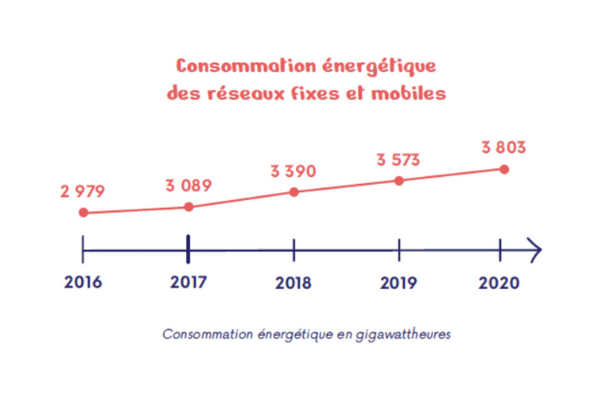 La consommation énergétique des réseaux fixes et mobiles n’a cessé de croître entre 2016 et 2020, pour atteindre 3 800 GWh. En moyenne, l’accroissement s’élève à +6 % par an. Au global, la consommation énergétique des réseaux (hors datacenters) provient à 85 % des réseaux d’accès, qu’ils soient fixes et mobiles, dont 58 % sont issus des boucles locales mobiles et 27 % des boucles locales fixes.
