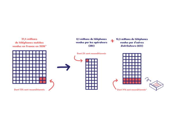 Ceux vendus reconditionnés (155 000 en 2020) par les opérateurs représentent une part très faible (2 %) des 8,1 millions de terminaux mobiles qu’ils ont vendus. En comparaison, sur l’ensemble des téléphones mobiles vendus en France (21,4 millions), 13 % étaient reconditionnés, soit 2,8 millions.