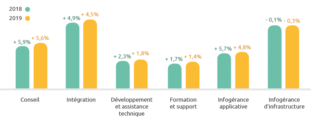 Concernant le Conseil et services (+3,0 % en 2019), le développement des nouvelles offres à forte valeur ajoutée (cyber-sécurité, IA, systèmes cognitifs…) alimentent le marché des ESN. Et ce sont les secteurs Banque-Assurance-Finance, Services aux entreprises et Utilities, qui portent la croissance.
