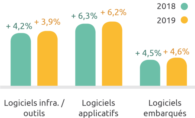 Pour l’édition de logiciels (+ 5,1 % en 2019), 74 % des acteurs augmentent leur chiffre d’affaires en 2018 notamment grâce au développement du mode SaaS proposé par 78 % d’entre eux fin 2018. Le SaaS affiche ainsi un boom de 24 % et représente, en 2018, 22 % du marché de l’édition (soit 2,8 milliards d’euros). Les secteurs Industrie, Banque-Assurance-Finance et Services aux professionnelles contribuent à cette croissance.