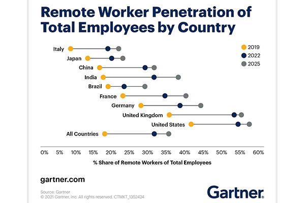 Gartner estime que 51% de salariés travailleront en mode hybride, soit au bureau et à domicile, au moins un jour par semaine en 2021. En France, 35% des collaborateurs travailleront à distance en 2022.